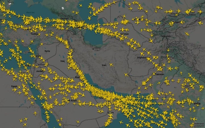 Дані Flightradar свідчать, що більшість цивільних літаків почали оминати повітряний простір Ірану, змінюючи маршрути через сусідні регіони.