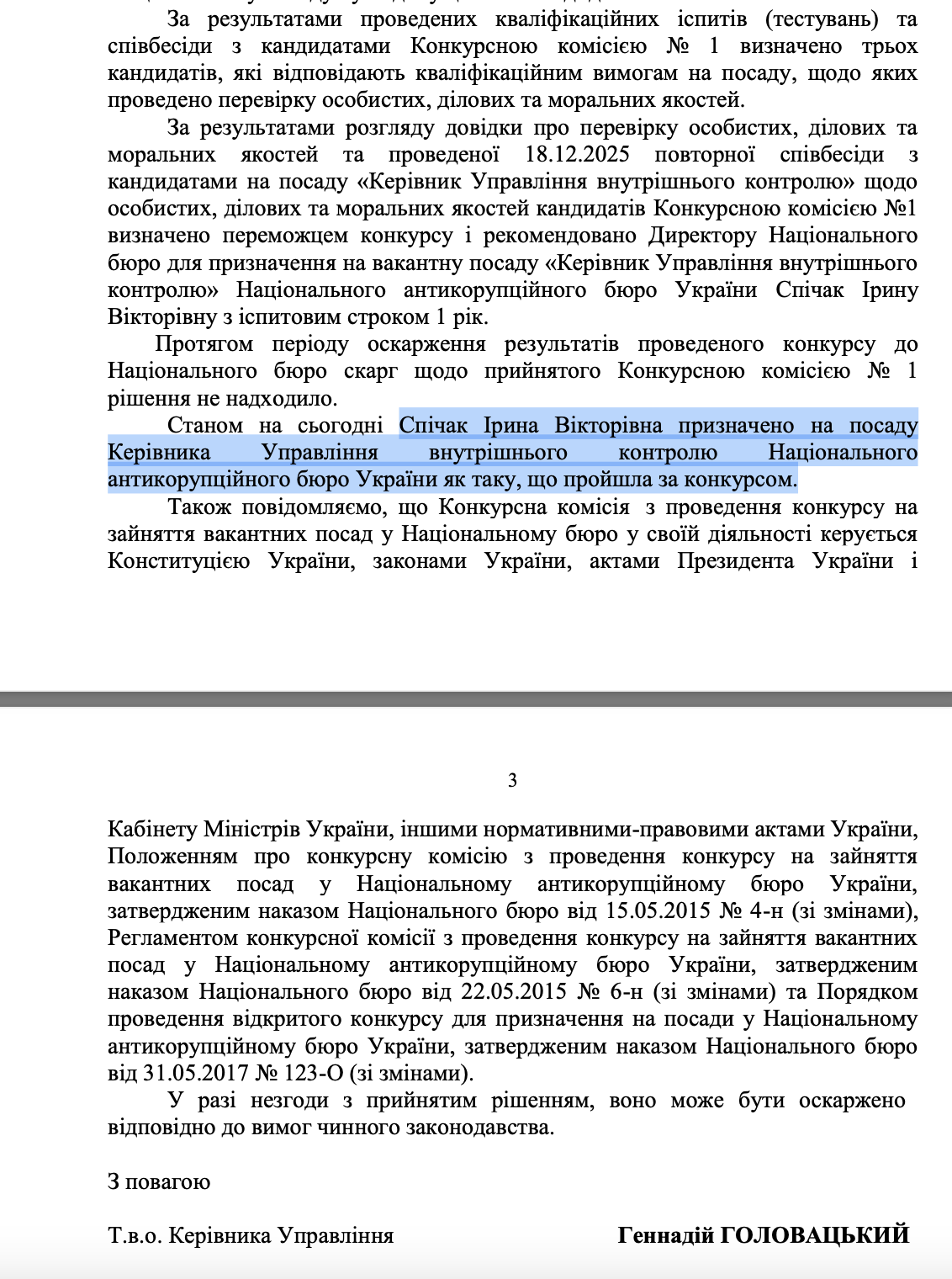 “Конкурсною комісією No1 визначено переможцем конкурсу і рекомендовано Директору Національного бюро для призначення на вакантну посаду «Керівник Управління внутрішнього контролю» Національного антикорупційного бюро України Спічак Ірину Вікторівну з іспитовим строком 1 рік.