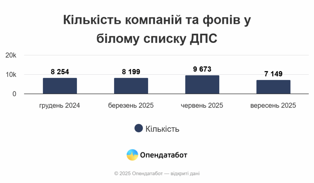 Станом на середину вересня 2025 року у Клубі білого бізнесу Державної податкової служби України зареєстровано 6 619 компаній та 530 ФОПів. Порівняно з попереднім кварталом, перелік прозорого бізнесу скоротився на 26%. Про це повідомляє «Комерсант Український» з посиланням на дані “Опендатабот”.