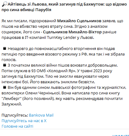 Він також поставив під сумнів поширену медіа інформацію про те, що батько військового “Лемберга” — це Михайло Сцельников, якого підозрюють у вбивстві нардепа Андрія Парубія.