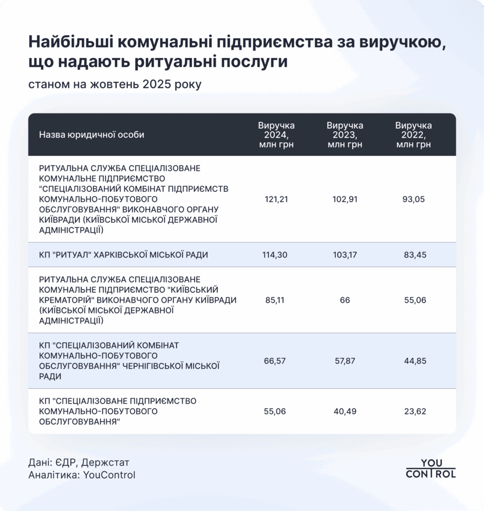 - Ритуальна служба СКП “Спецкомбінат ПКПО” (Київ) — понад 100 млн грн виторгу у 2024 році;