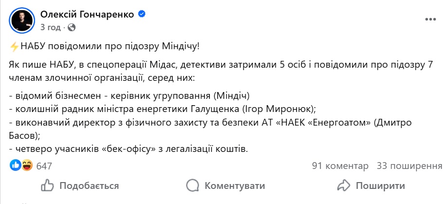 Національне антикорупційне бюро України оприлюднило деталі операції «Мідас», у межах якої викрито високорівневу злочинну організацію, що діяла у сфері енергетики.