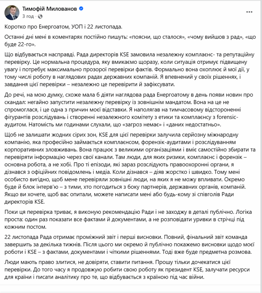 Милованов зазначив, що запуск такої процедури — стандартна практика для KSE у випадках, коли ситуація набуває суспільної уваги та вимагає максимальної прозорості.