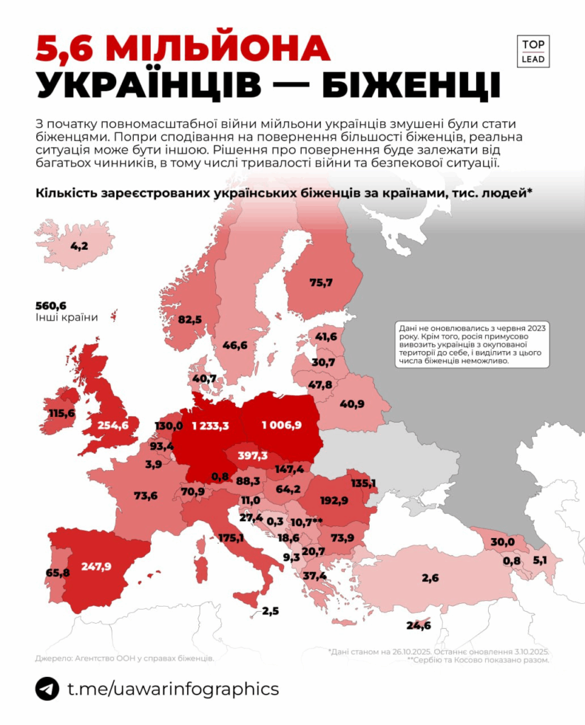 Дані актуальні станом на 26.10.2025. Водночас варто розуміти, що Росія примусово вивозить українців з окупованих територій до себе, і виділити саме біженців серед цих переміщених осіб неможливо. Тому загальносвітова цифра 5,6 мільйона не відображає повної картини примусових депортацій, а також внутрішнього переміщення в Україні.
