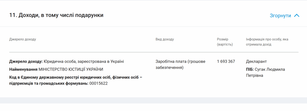 У 2024 році в Мін’юсті зарплата Сугак склала 1 693 367 гривень.