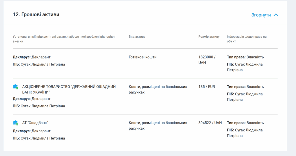 На рахунках у банку Сугак зберігає 394522 грн і 185 Євро.