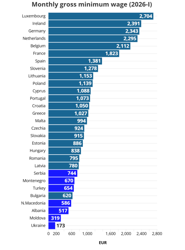 Станом на січень 2026 року мінімальна місячна зарплата в країнах Європейського Союзу коливається від 620 євро в Болгарії до 2704 євро в Люксембурзі. Якщо враховувати також країни-кандидати на вступ до ЄС, найнижчий рівень мінімальної зарплати зафіксовано в Україні — лише 173 євро на місяць. Про це повідомляє «Комерсант Український» з посиланням на Euronews.