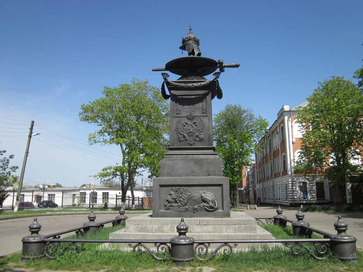 Перший пам’ятник на цьому місці було зведено у 1817 році у вигляді цегляного обеліска. У 1849 році його замінили чавунним обеліском, виготовленим у Петербурзі за проєктом архітектора Брюллова та художника Гамбургера. Пам’ятник має висоту 7,2 метра і складається з прямокутного триярусного чавунного обеліска на гранітному стилобаті. Верхівку прикрашають щит, меч та шолом, а на площинах розміщені горельєфні зображення герба російської імперії, лева, що відпочиває, та меморіальні написи.