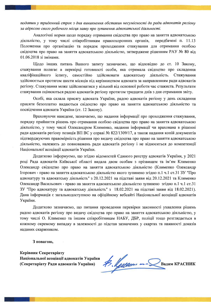 “Надання інформації про проходження стажування, порядку прийняття рішень про отримання особою свідоцтва про право на заняття адвокатською діяльністю, у тому числі Олександром Клименко, надання інформації чи врахована в рішенні ради адвокатів регіону позиція ВП ВС у справі Nº 822/1309/17, а також надання копій документів підтверджуючих правомірність рішення про видачу свідоцтва про право на заняття адвокатською діяльністю, належить до повноважень ради адвокатів регіону”, – йдеться у відповіді НААУ на запит видання.