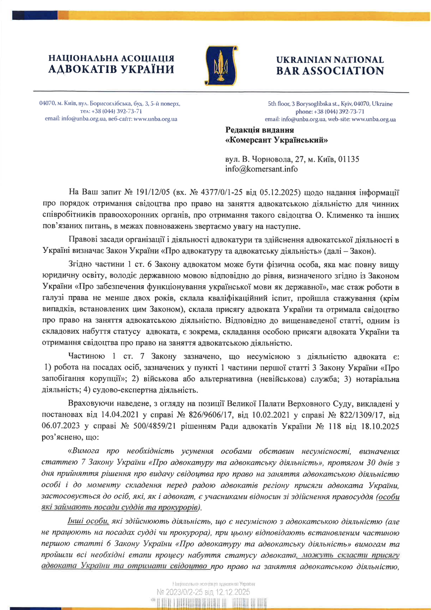 Перевірка правомірності видачі керівнику САП Олександру Клименко свідоцтва на право зайняття адвокатською діяльністю належить до повноважень ради адвокатів регіону, тобто Київської області. Про це «Комерсант Український» поінформували в Національній асоціації адвокатів України офіційним листом. В НААУ наголошують, що питання про проведення подібних перевірок, у тому числі стосовно Клименко та інших співробітників НАБУ, ДБР чи поліції розглядається в кожному випадку окремо “в залежності до підстав”.
