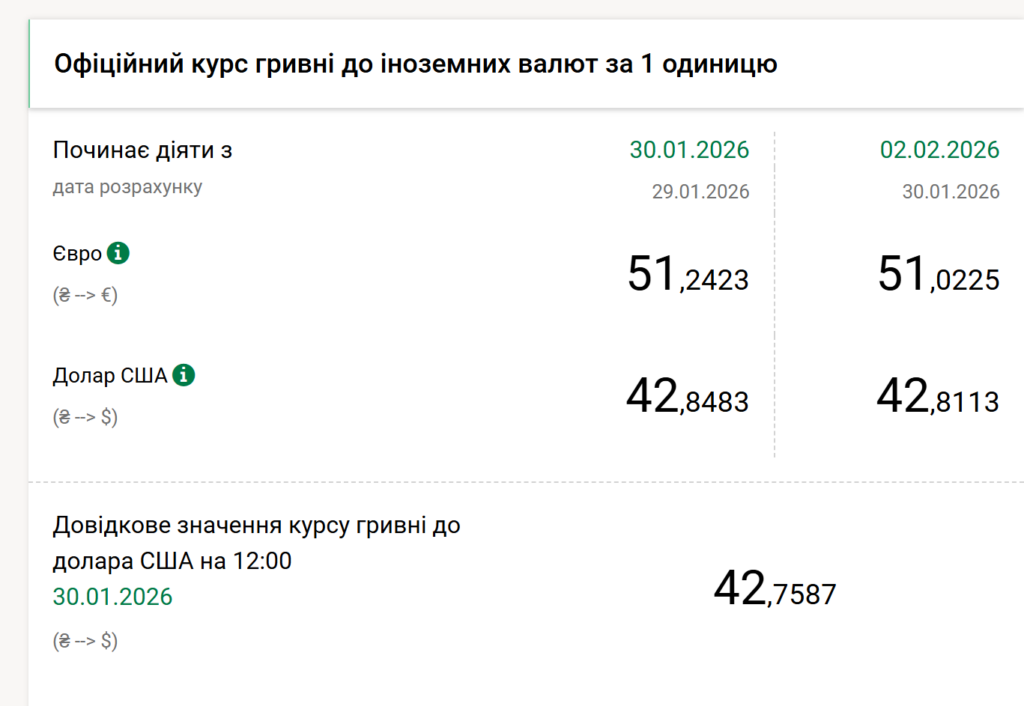 На 2 лютого НБУ встановив офіційний курс долара на рівні 42,81 грн, що на 3 копійки менше, ніж у п’ятницю, 30 січня (42,84 грн).