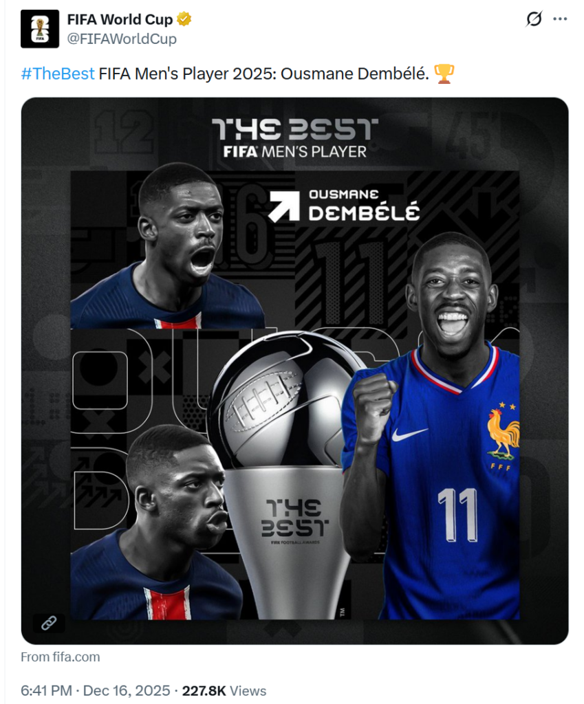 Названо найкращого футболіста 2025 року за версією ФІФА