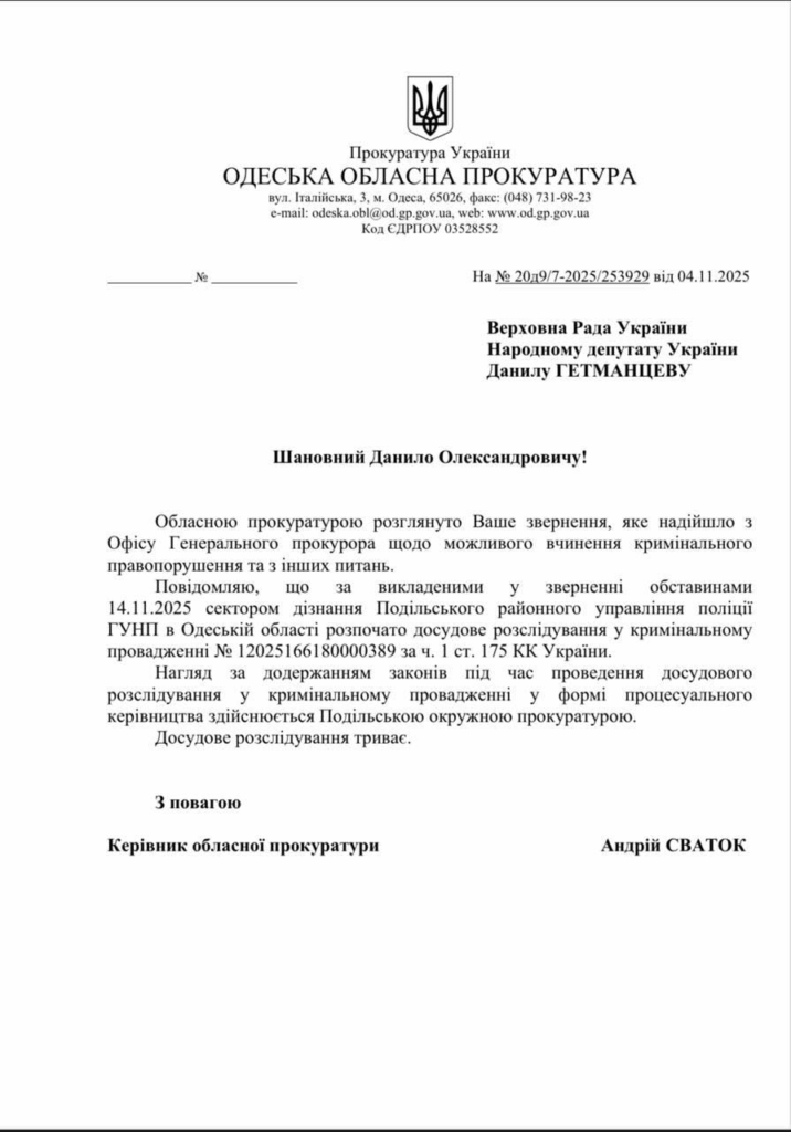 Як зазначено в документі, за викладеними у зверненні обставинами 14 листопада 2025 року слідчі Подільського районного управління поліції ГУНП в Одеській області розпочали кримінальне провадження №12025166180000389 за ч. 1 ст. 175 Кримінального кодексу України (невиплата заробітної плати, стипендії, пенсії чи інших установлених законом виплат).