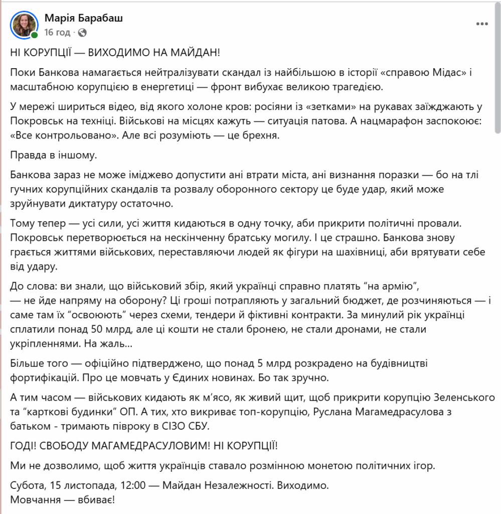 В Україні наростає суспільне обурення через корупційні скандали у сфері енергетики та оборони. На тлі «справи Мідас» та інформації про масштабні зловживання в секторі енергетики з’явився заклик вийти на протест 15 листопада на Майдан Незалежності під гаслом «НІ корупції». Відповідний допис опублікувала голова правління ГО “Спротив” Марія Барабаш, повідомляє «Комерсант Український»