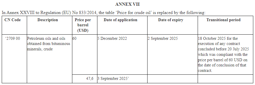 3 вересня вступило в дію рішення Європейського Союзу про зниження граничної ціни на російську нафту до 47,6 долара за барель замість попередніх 60 доларів, повідомляє «Комерсант Український».