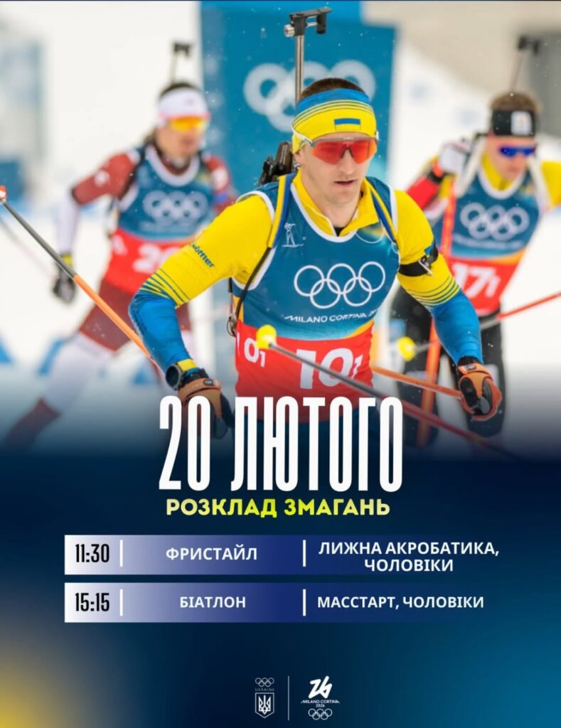 20 лютого 2026 року збірна України продовжує виступи на ХХV зимових Олімпійських іграх у Мілані-Кортіні (Італія). У цей день українські спортсмени змагатимуться у двох видах спорту — лижній акробатиці (фристайл) і біатлоні, де будуть розіграні медалі.