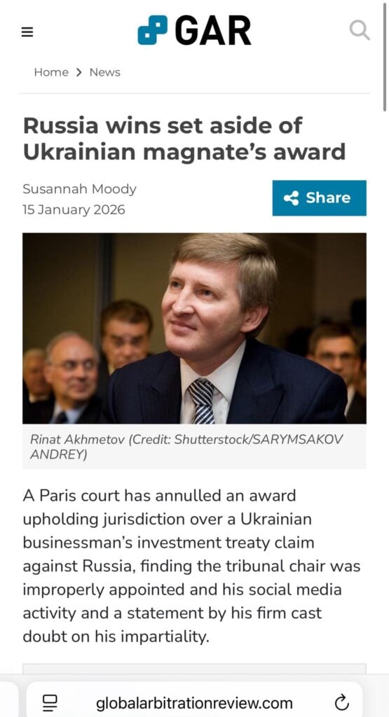 Паризький суд ухвалив рішення про скасування арбітражного рішення, яке підтверджувало юрисдикцію у справі за позовом українського бізнесмена Ріната Ахметова проти російської федерації за інвестиційним договором. Йшлося про компенсацію збитків, завданих агресією рф. Про це повідомляє «Комерсант Український» з посиланням на Global Arbitration Review.