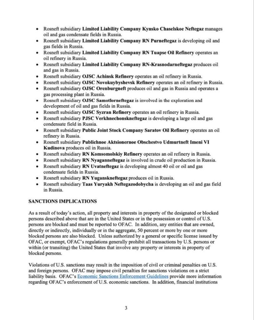 Він уточнив, що нові санкції спрямовані проти двох найбільших російських нафтових компаній — ПАТ “НК Роснефть” та “Лукойл”.
