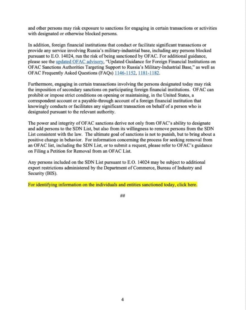 Усі активи та інтереси у власності осіб, зазначених вище, що перебувають у США або під контролем американських осіб, блокуються. Заборонені будь-які транзакції, що включають ці активи (якщо не була отримана спеціальна ліцензія OFAC). Порушення санкцій можуть призвести до цивільної або кримінальної відповідальності.