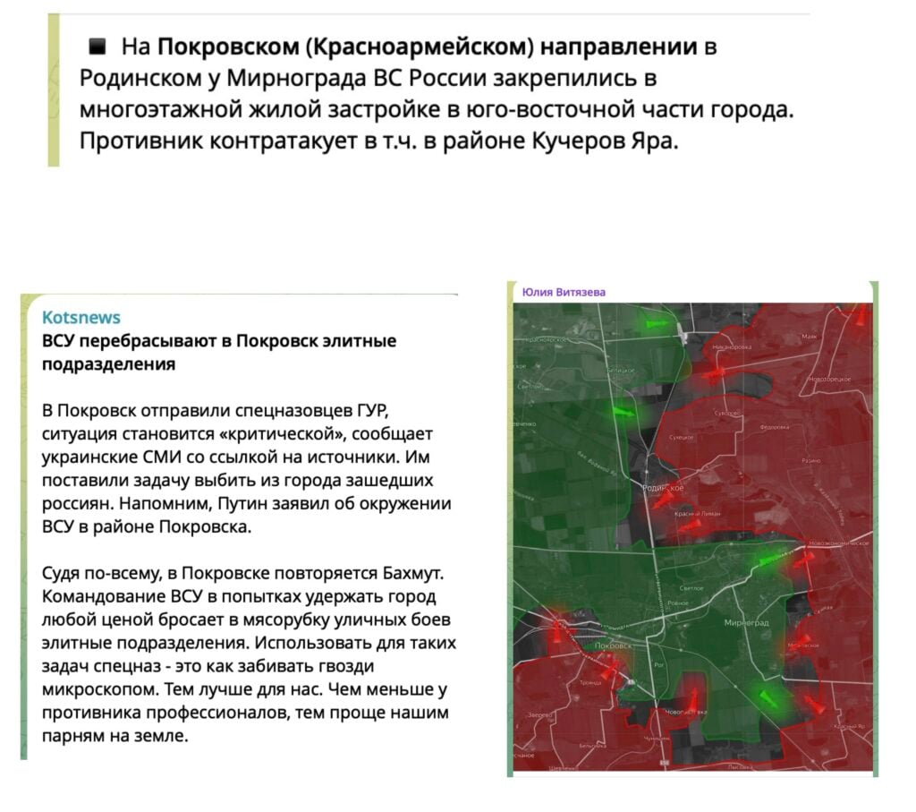 Російські пропагандисти активно цитують українські та західні медіа, перекручуючи зміст їхніх повідомлень. Зокрема, констатують факт, що ЗСУ перекидають у Покровськ елітні підрозділи і що поставлено завдання вибити з міста російських військових. Telegram-канал Kotsnews додає маніпулятивний висновок.