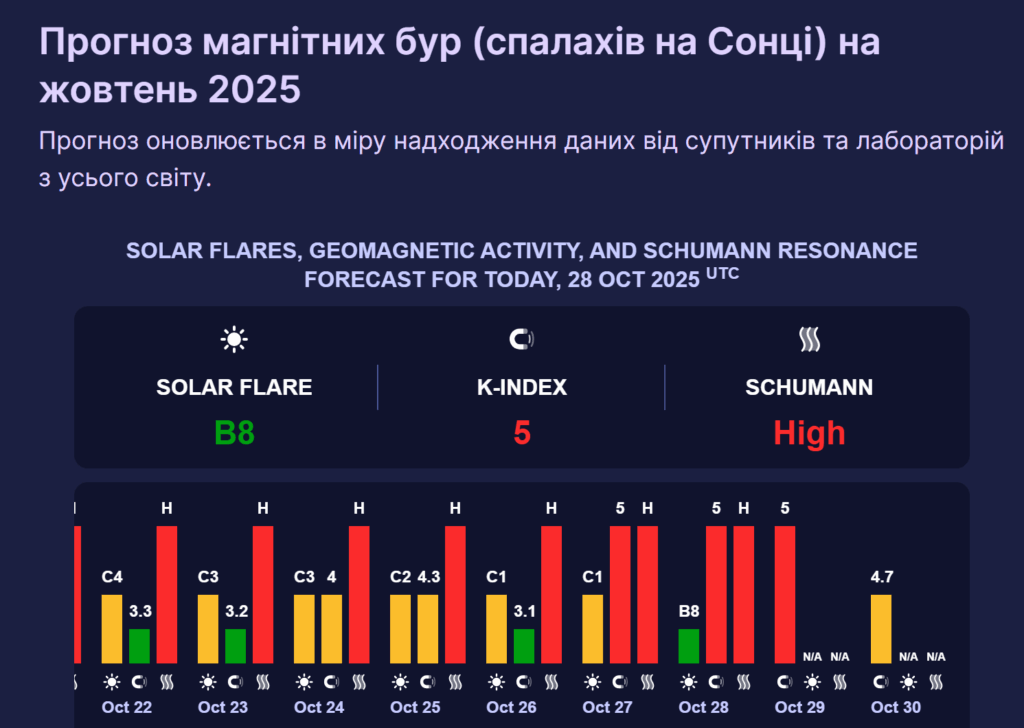 За прогнозом Meteoagent, 29 жовтня інтенсивність збурення знизиться до 4,7 балів за К-індексом — це жовтий рівень небезпеки, який відповідає середній магнітній бурі.