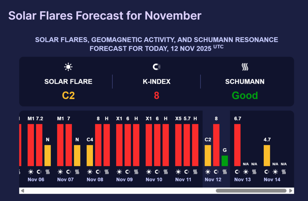 У четвер, 13 листопада, космічна погода також буде несприятливою. Зокрема, магнітні коливання становитимуть 6,7 бала.