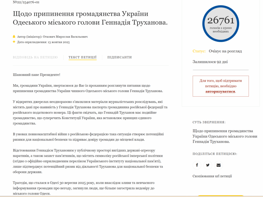 Петиція із закликом припинити громадянство Одеського міського голови Геннадія Труханова зібрала понад 25 тисяч підписів, необхідних для розгляду главою держави, повідомляє «Комерсант Український»