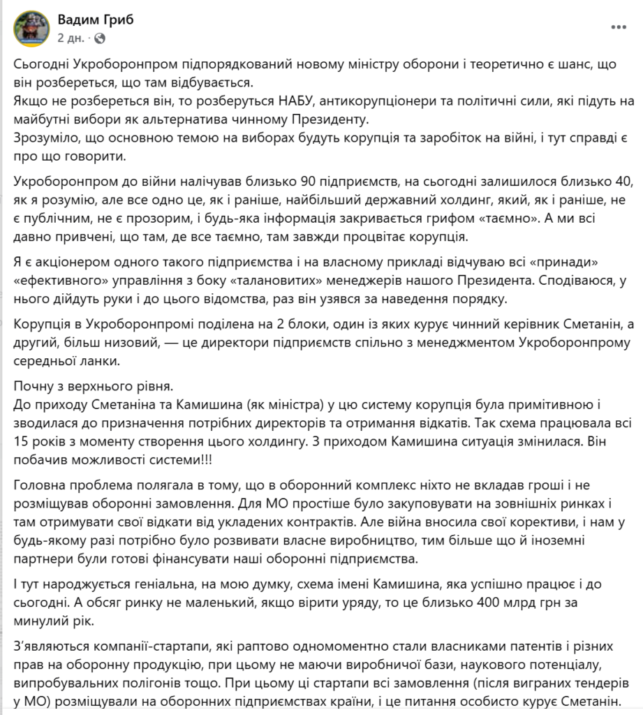 «До війни в оборонний комплекс ніхто не вкладав гроші. МО було простіше закуповувати за кордоном. Але війна внесла свої корективи, і з’явилася, на мій погляд, “геніальна” схема», — пише Гриб.