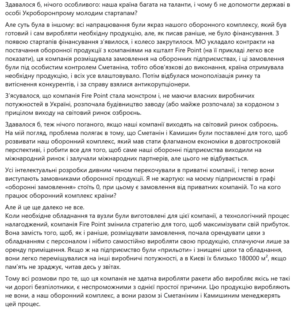 «Тому всі розмови про те, що ця компанія не здатна виробляти ракети або виробляє якісь не такі чи дорогі безпілотники, є неспроможними з однієї простої причини. Цю продукцію виробляють не вони, а наш оборонний комплекс, а вони разом зі Сметаніним і Камишиним менеджерять цей процес. За такої схеми майбутнє є лише у цих стартапів, а наш оборонний комплекс піде за копійки, як це було завжди в умовах приватизації, хоча у нас був реальний шанс підняти капіталізацію оборонних підприємств», — додає Гриб.