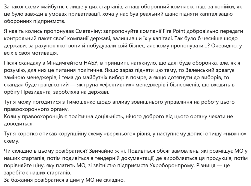 За його слова він “навіть колись пропонував Сметаніну: запропонуйте компанії Fire Point добровільно передати контрольний пакет своєї компанії державі, залишивши їх у капіталі”.