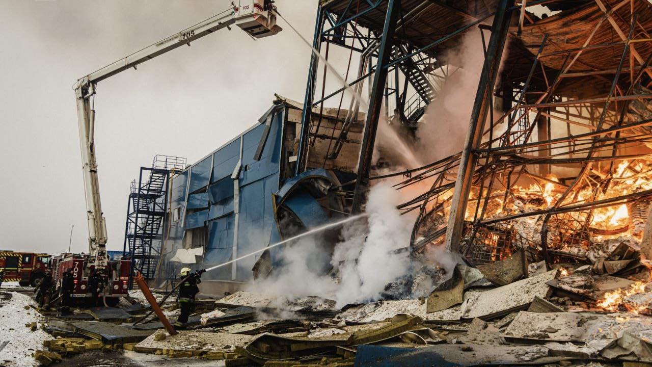 ДСНС Харківщини повідомила про ракетний удар по складській будівлі цивільного підприємства у передмісті Харкова: виникла масштабна пожежа площею понад 5000 кв. м. Значних руйнувань зазнали будівельні конструкції.