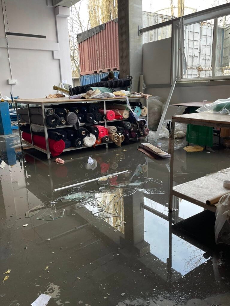 Він уточнив у коментарі LIGA.net, що було кілька ударів на межі ділянки підприємства, розташованої на лівому березі Києва у Дніпровському районі. Пошкоджено складські та виробничі приміщення, частково постраждала тканина, яку залило водою. Розмір збитків поки що не відомий.