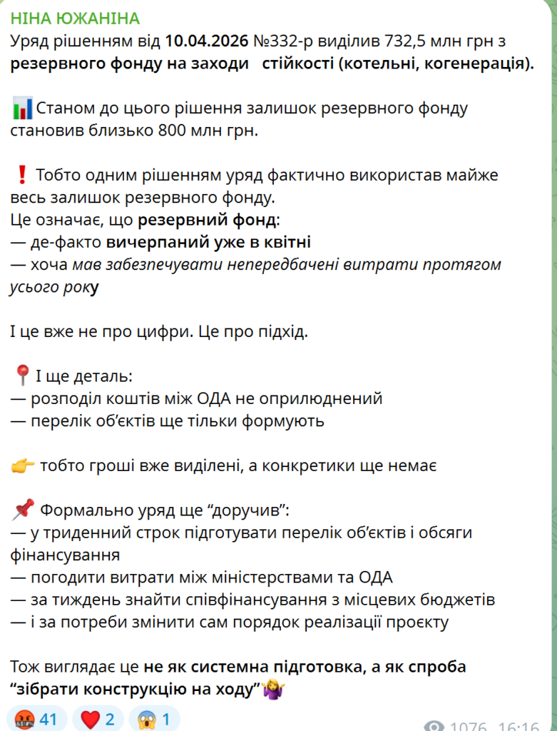 Уряд України рішенням від 10 квітня 2026 року №332-р виділив 732,5 млн грн із резервного фонду державного бюджету на заходи стійкості, зокрема на котельні та когенерацію. Після цього народна депутатка Ніна Южаніна заявила, що резервний фонд фактично майже вичерпано вже навесні, хоча він мав би покривати непередбачені витрати протягом усього року. Про це Южаніна написала у соцмережах, інформує «Комерсант Український»