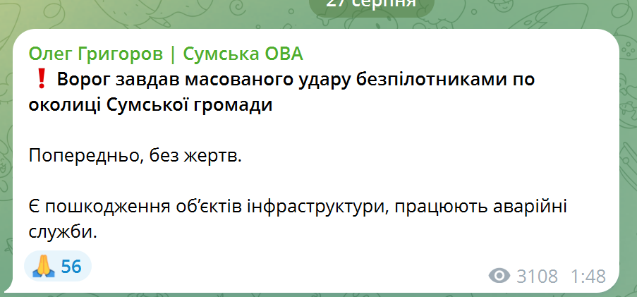В ніч на 27 серпня, російські окупаційні війська здійснили масовану атаку дронів на Суми. Внаслідок обстрілу є пошкодження інфраструктури. Про це повідомляє «Комерсант Український» з поиланням на Telegram глави Сумської ОВА Олега Григорова і канал в.о. міського голови Сум Артема Кобзара.