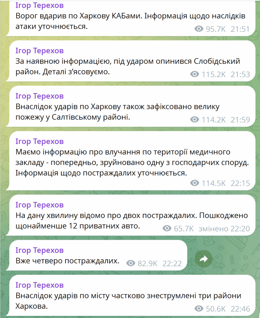 Пізніше він повідомив, що внаслідок ударів по Харкову виникла велика пожежа у Салтівському районі.