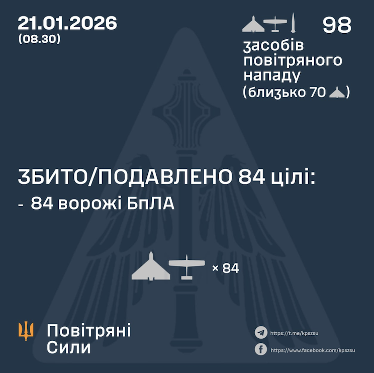 У ніч на 21 січня Росія здійснила масовану повітряну атаку по Україні, застосувавши балістичну ракету “Іскандер-М” та 97 ударних безпілотників різних типів. Про це повідомили Повітряні сили ЗСУ, інформує «Комерсант Український»