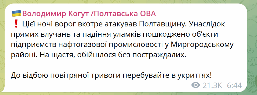 “Унаслідок прямих влучань та падіння уламків пошкоджено обʼєкти підприємств нафтогазової промисловості у Миргородському районі”, – повідомив Когут.