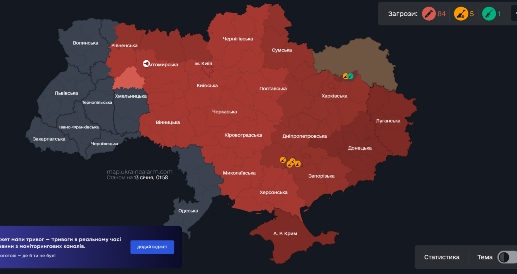 Станом на 01:30 карта повітряних тривог має такий вигляд. Як можна побачити, сигнал продовжується у Київській, Житомирській, Рівненській, Чернігівській, Сумській, Черкаській, Кіровоградській, Миколаївській, Харківській, Дніпропетровській, Запорізькій, Херсонській, Полтавській та Донецькій областях.