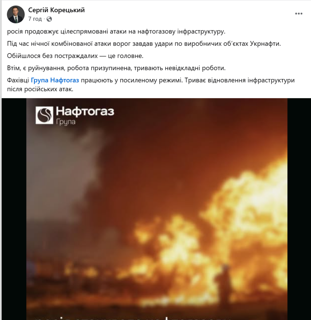 «Під час нічної комбінованої атаки ворог завдав ударів по виробничих об’єктах “Укрнафти”. Є руйнування, роботу зупинено», — зазначив Корецький.