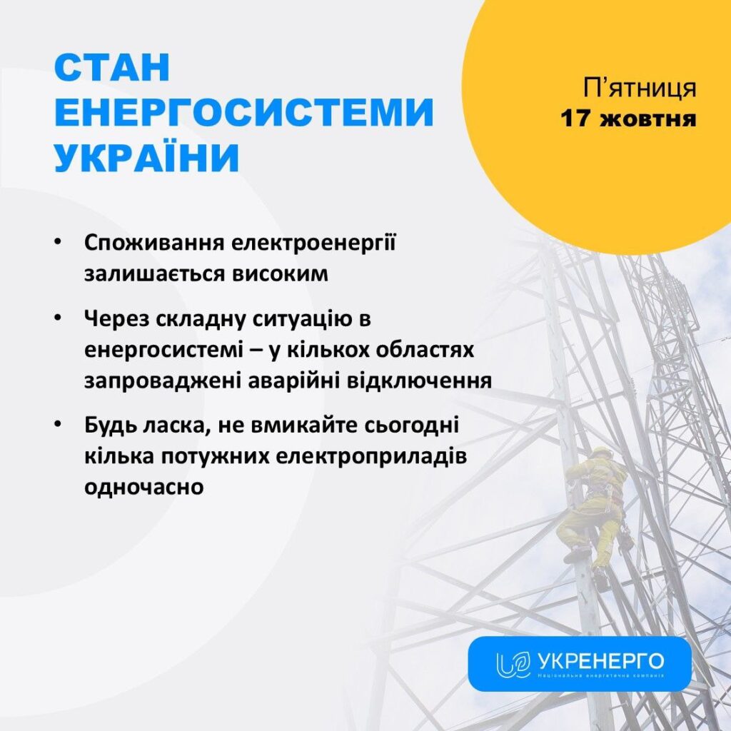 Сегодня, 17 октября, украинская энергосистема находится под высокой нагрузкой. Из-за сложной ситуации в некоторых областях введены аварийные отключения электроэнергии, а жителям и промышленным потребителям рекомендуют экономно пользоваться электроприборами. Об этом сообщает «Коммерсант Украинский» со ссылкой на Укрэнерго.