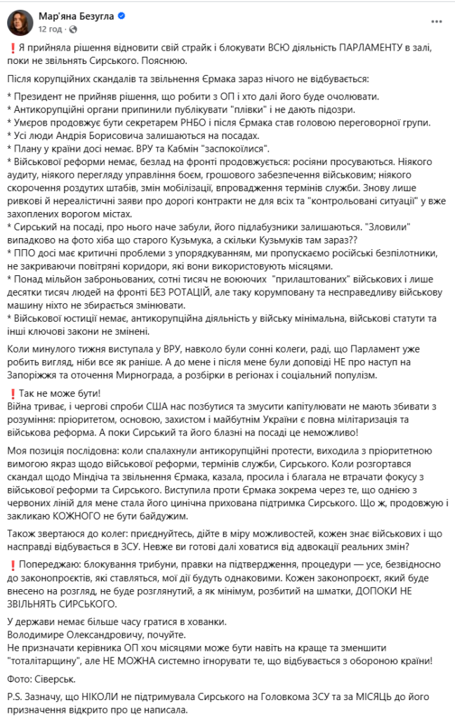 Народный депутат Марьяна Безуглая заявила о возобновлении своей забастовки в Верховной Раде и объявила ультиматум: ВРУ не будет рассматривать ни одного законопроекта, пока не будет уволен Главнокомандующий ВСУ Александр Сырский. Об этом она написала в своем публичном обращении, резко раскритиковав состояние оборонного управления, политические решения власти и отсутствие реальных военных реформ, информирует «Коммерсант Украинский»