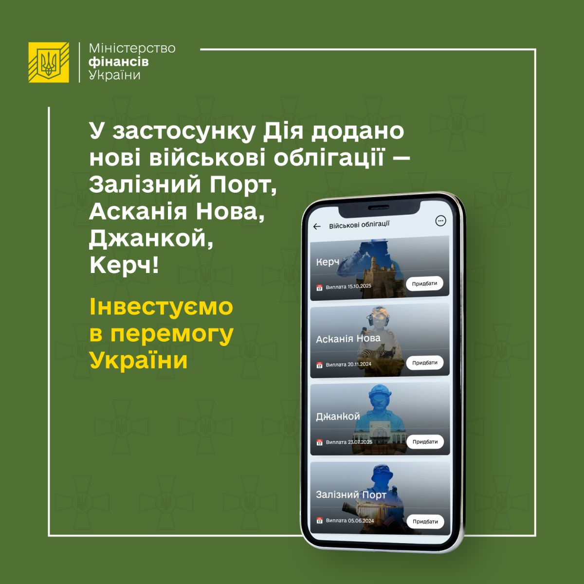 В приложении "Дия" запустили новые военные облигации: Железный Порт, Аскания-Нова, Джанкой и Керчь. Об этом сообщает со ссылкой на Министерство цифровой трансформации Украины. "Города, вошедшие в новую серию облигаций - Железный Порт, Аскания-Нова, Джанкой, Керчь - являются символами Украины. Купите облигации через "Дию", чтобы способствовать более быстрому возвращению этих городов