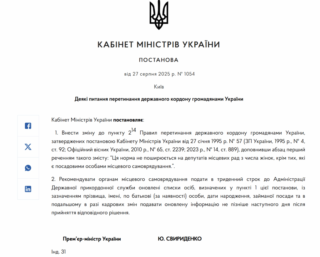 Как указано в постановлении, запрет на пересечение государственной границы теперь не распространяется на женщин — депутатов местных советов. Однако это не касается должностных лиц местного самоуправления.