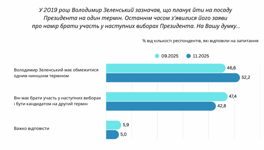 - 52,2% опрошенных считают, что Зеленский должен ограничиться одним сроком и не баллотироваться на следующих выборах.