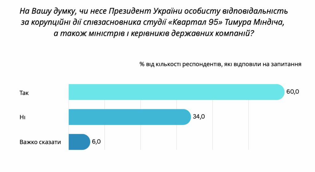 Социологи также спросили граждан, несет ли Зеленский личную ответственность за возможные коррупционные действия Тимура Миндича и других фигурантов резонансного дела.