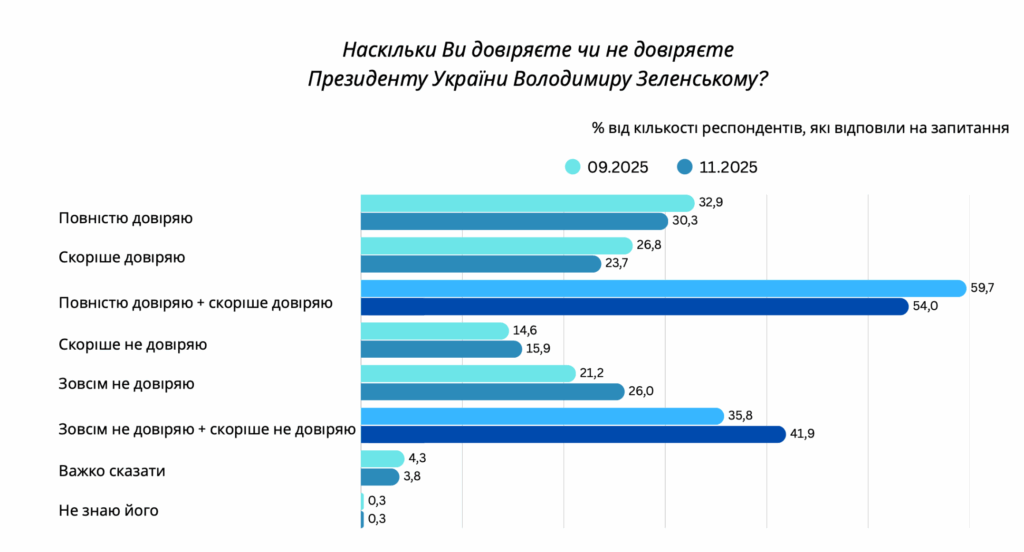 - 54% украинцев заявили, что доверяют Зеленскому (в том числе полностью доверяют ему 30,3% респондентов, а скорее доверяют — 23,7% респондентов)