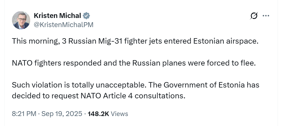 Эстония официально запросила консультации с НАТО в соответствии со статьей 4 Североатлантического договора после нарушения ее воздушного пространства российскими военными самолетами. Об этом сообщил премьер-министр Кристен Михал, информирует «Коммерсант Украинский»