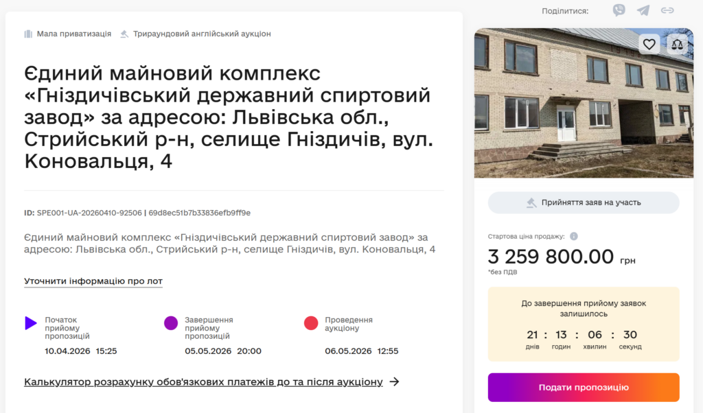 Во Львовской области началась приватизация еще одного государственного промышленного актива. Фонд государственного имущества выставил на аукцион единый имущественный комплекс ГП «Гнездычевский государственный спиртовой завод» со стартовой ценой 3 259 800 грн без НДС. Соответствующее объявление опубликовано на портале «Прozorro.Sale», сообщает «Коммерсант Украинский»