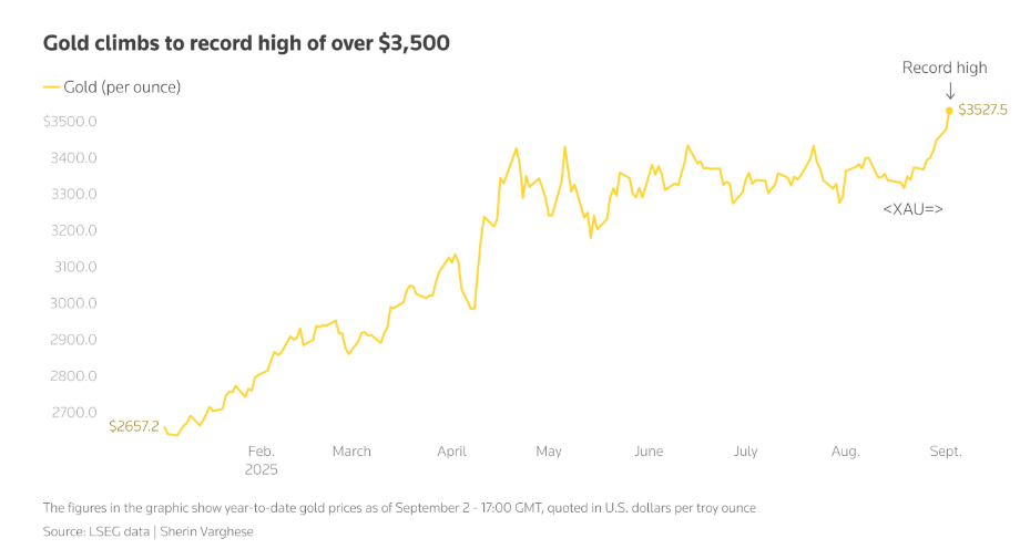 Спотовое золото 2 сентября обновило максимум на уровне 3527,5 доллара за унцию. Эксперты прогнозируют диапазон 3600-3900 долларов в ближайшей перспективе и не исключают достижения отметки 4000 долларов в 2026 году, если сохранятся экономическая и геополитическая неопределенность.
