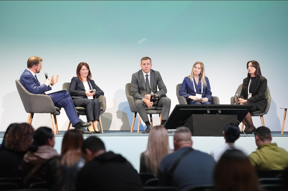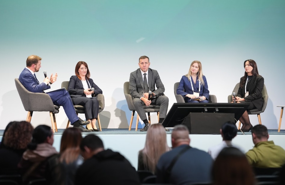 Модераторка О. Духнич (Институт фронтира) панели «Люди, бизнес и реальность 2025» вместе со спикерами И. Пасечник (ALVIVA GROUP), Т. Николовой (благотворительный фонд «Жизнелюб»), Ю. Жовтяк (Государственная служба занятости), С. Савицким (KSE ProfTech) и А. Бабичем (ДІЛА) обсудили трансформацию ценностей труда, ожидания молодежи, новые модели занятости, мотивации и обучения, которые формируют современный рынок труда.